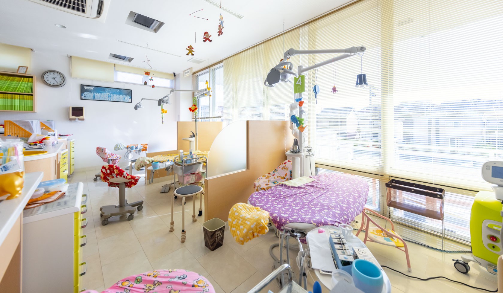 待合室には、ボールプールやボルダリングといった遊べるコーナーがあります。診療室は天井にモニターが備えられ、アニメを観ながら治療を受けられる環境です。授乳室やオムツ替えシート、個室の相談室も完備しており、患者様が安心して通えるよう複数の空気清浄機を導入した感染対策も徹底しています。