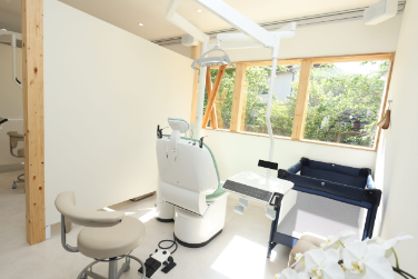 院内は、患者様の快適性を重視した設計となっています。待合室は杉の無垢板張りで、素足でも快適に過ごせる空間です。お子様向けには、ボルダリングウォールを備えたキッズスペースが用意されており、歯医者嫌いを防ぐ工夫がなされています。また、ユニバーサルデザインを採用し、車椅子やベビーカーでも利用しやすい環境を整えています。診療チェア横のスペースも広く、ベビーベッドも設置。さらに、授乳やおむつ替えのスペースも提供しており、親御様にも安心して通院いただける環境が整っています。