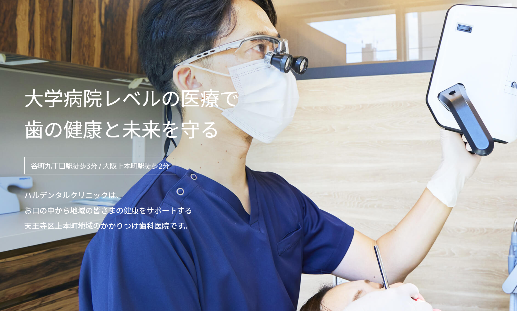 ハルデンタルクリニックは、谷町線谷町九丁目駅 11番出口 から徒歩3分、近鉄大阪線大阪上本町駅 11番出口から 徒歩2分、のところにあります。診療科目は、一般歯科、予防歯科、小児歯科、矯正歯科、審美歯科、インプラント、入れ歯となっています。