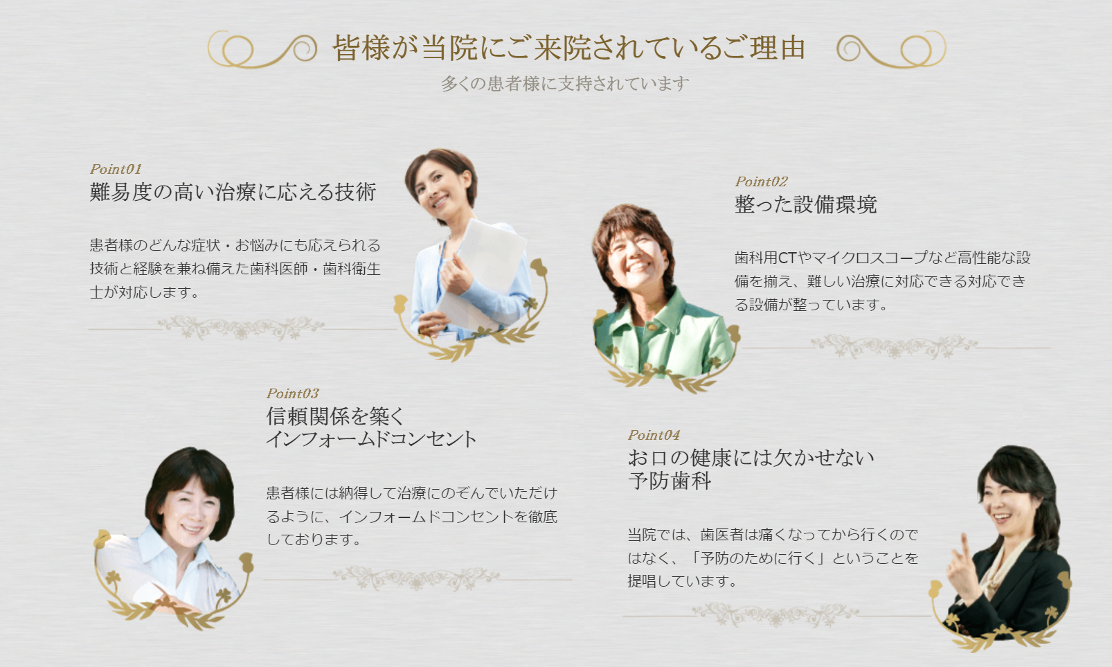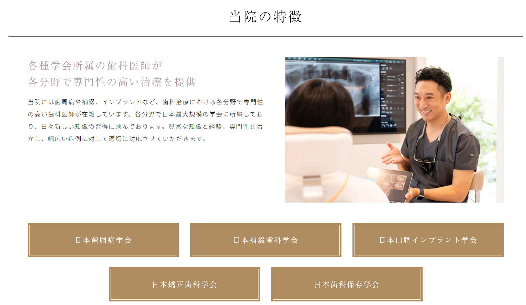 院長は、日本歯周病学会 認定医で、在籍医師は、日本歯科保存学会 認定医です。当院には歯周病や補綴、インプラントなど、歯科治療における各分野で専門性の高い歯科医師が在籍しています。