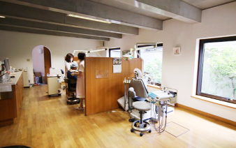 診療室は中庭の見える大きな窓があり、明るく開放的な空間となっています。各ユニットにはパーテーションを設置し、プライバシーにも配慮されています。待合室には新聞や雑誌を用意し、お子様向けにはキッズコーナーも完備。リラックスした雰囲気で治療を受けたい方や、お子様の歯科治療に不安をお持ちの親御様におすすめの医院です。