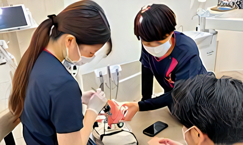 院内には院長を含む3名の歯科医師が在籍しており、担当歯科医師制を採用しています。歯科医師同士は協力しながら診察を行い、治療方法などを共に決定します。担当医師と患者様が治療方針を決める際、場合によっては複数の医師が意見を出し合い、最適な治療を提供するために話し合います。3名の医師のうち1名は女性医師であり、女性の患者様も気兼ねなく相談できる環境が整っています。