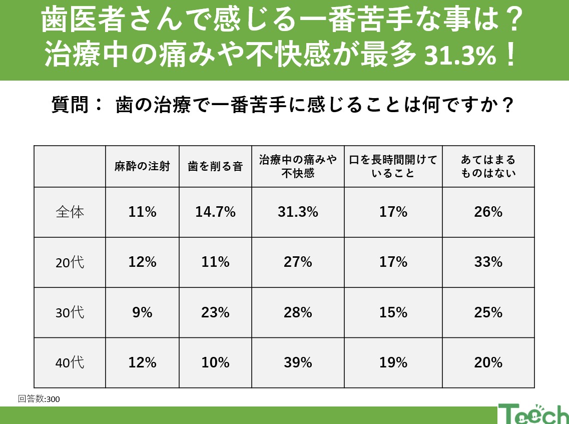 歯医者さんに行くとき、治療中の痛みや不快感が心配になる方は少なくありません。今回、20代から40代の男女300人を対象にしたアンケート調査では、多くの方が治療中の「痛みや不快感」を苦手と感じていることがわかりました。本記事では、この結果をもとに、治療中の不安を減らすためのヒントをお届けします。