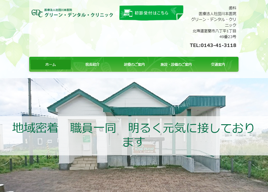 グリーンデンタルクリニックは、JR東室蘭駅 西口から車で北西へ7分、バス「八丁平中央」停留所から徒歩2分の場所に医院を構えています。6台分の駐車スペースが用意されているため、お車での通院にも適しています。