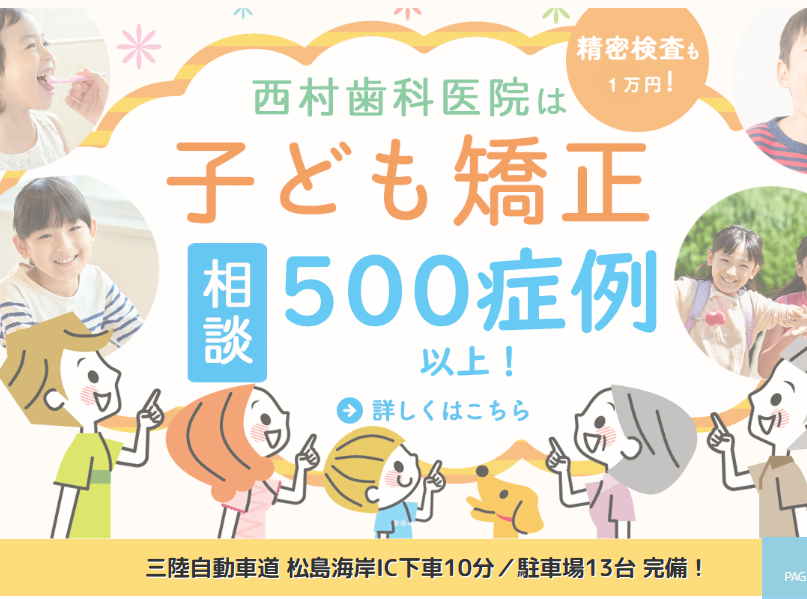 西村歯科医院は、JR高城町駅から東へ徒歩9分、海からほど近い場所で診療を行っています。駐車場は13台分と多数用意されているので、お車での通院にも適しています。