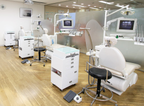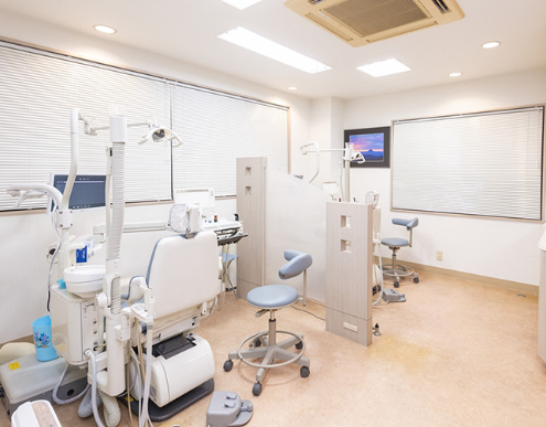 院内設備としてマイクロスコープなどの最新機器を完備し、痛みの少ないEr:YAGレーザーを導入することで、より精密で快適な治療を実現しています。待合室には大型テレビを設置してお子様も退屈せずに過ごせる空間を作り、院内はバリアフリー設計で土足利用も可能なため、車椅子の方も安心して移動できます。さらに、待合室と診療室の間にはパウダーコーナーを設け、診療の前後で身だしなみを整えられるよう配慮しています。