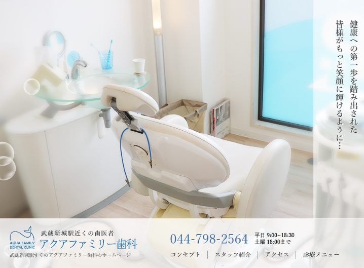 アクアファミリー歯科は、JR武蔵中原駅 南口から南東へ徒歩14分の場所に医院を構えています。医院の真横には6台分の駐車場が完備されているので、車での通院も便利です。