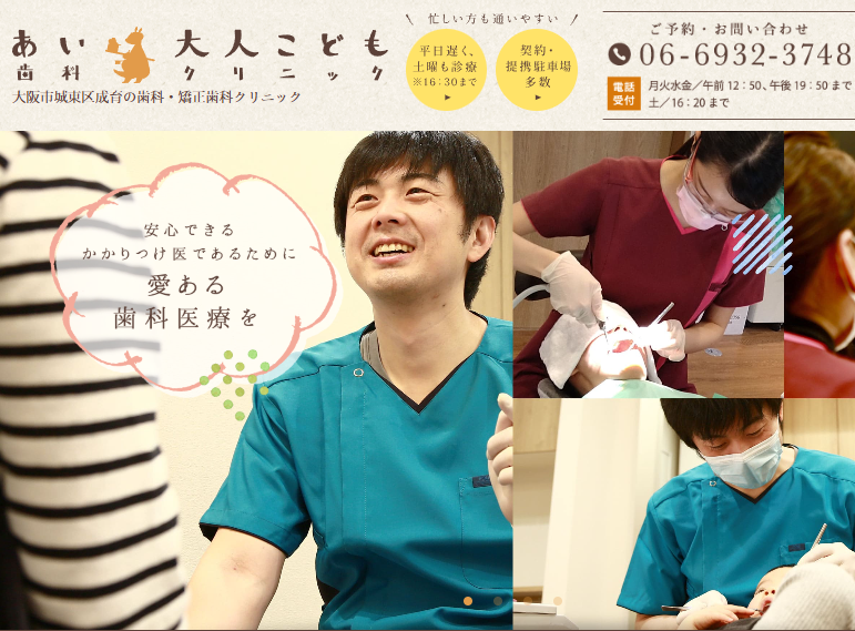 あい大人こども歯科クリニックは、大阪メトロ 野江内代駅 1番出口から東へ徒歩7分、JR野江駅から北へ徒歩2分と、各駅から近い場所に位置しています。平日20時までの診療に加え、隔週で日曜診療も実施。近隣には提携駐車場も確保され、バリアフリー設計のため、お子様からご年配の方まで、どなたでも快適に通院しやすい環境です。