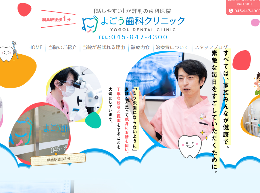 よごう歯科クリニックは、東急電鉄 綱島駅 南口から徒歩1分にある、T`S BRIGHTIA綱島1階に位置しています。土日・祝日も診療を行っているため、平日は忙しい学生の方や社会人の方でも通院しやすい医院といえるでしょう。