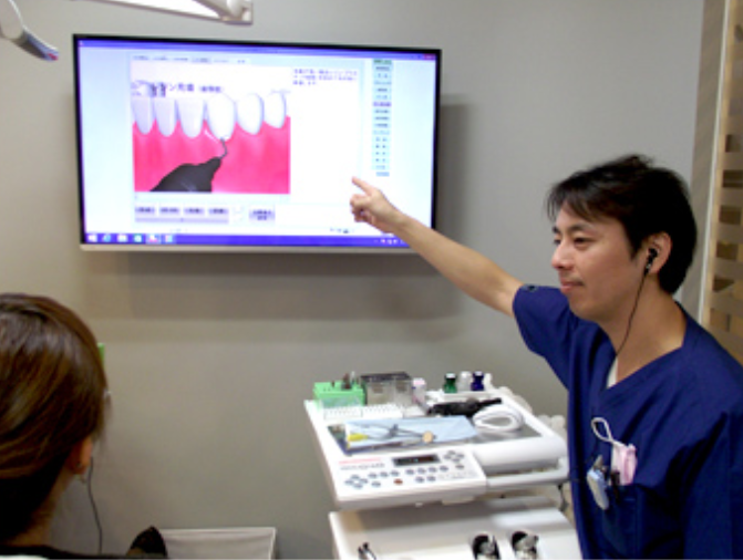 診察台一台一台にモニターを設置し、治療のシミュレーション画像や口腔内カメラの映像を使って分かりやすく説明を行っています。患者様が迷われている場合は無理に結論を急かすことなく、十分に検討する時間を設けているため、納得して治療を受けられる医院となっています。