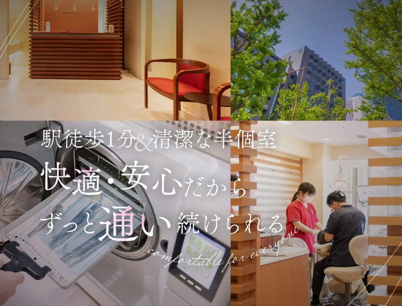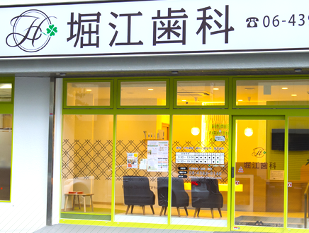 堀江デンタルクリニックは、大阪メトロ 四ツ橋駅 4番出口から徒歩1分、大輪ビルの2階に入っています。平日は夜7時半まで診療を行い、急な痛みにも対応しているため、仕事や学業で忙しい患者様も通院しやすい環境となっています。