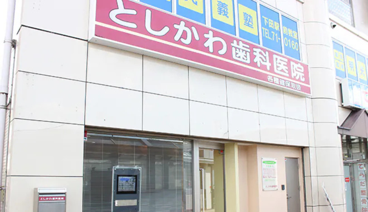 としかわ歯科医院は、近鉄下田駅出口3から徒歩3分の場所にあります。専用駐車場も完備されており、通院しやすい環境が整っています。診療科目は、一般歯科・矯正歯科・小児歯科・予防歯科・口腔外科・審美歯科・口臭治療・歯周病治療・入れ歯(義歯)・ホワイトニング・顎関節症など幅広く対応しており、土曜は、第2・第4のみ診察を行っています。