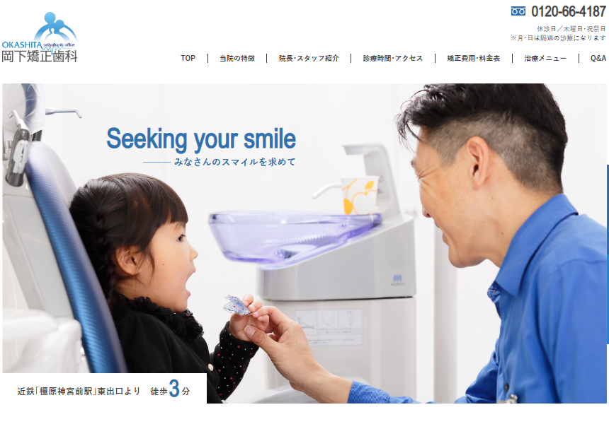 岡下矯正歯科は、近鉄 畝傍御陵前駅 東出口から南へ徒歩18分、橿原神宮前駅 東出口から東へ徒歩3分の場所に位置しています。