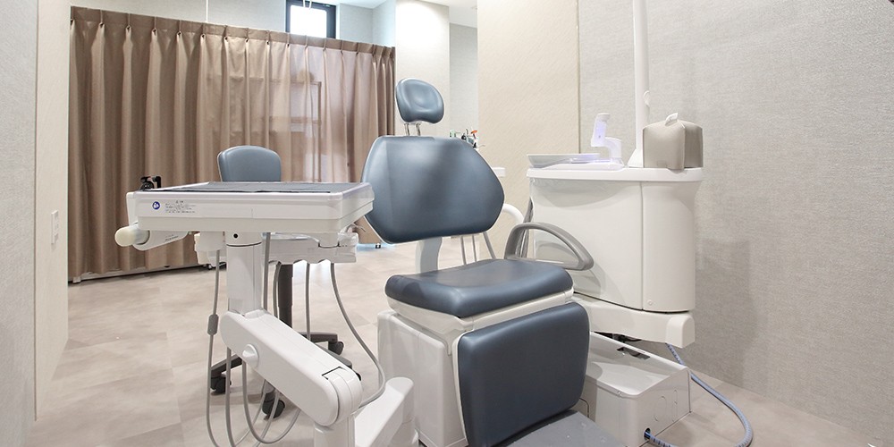 院内は「歯医者らしくない」明るく楽しい雰囲気が特徴で、お家のリビングのように落ち着ける待合室やキッズルームが完備されています。診療室はパーテーションで仕切られたゆったりとした空間で、各ユニットにはお口の状態を確認できる口腔内カメラが設置されています。
