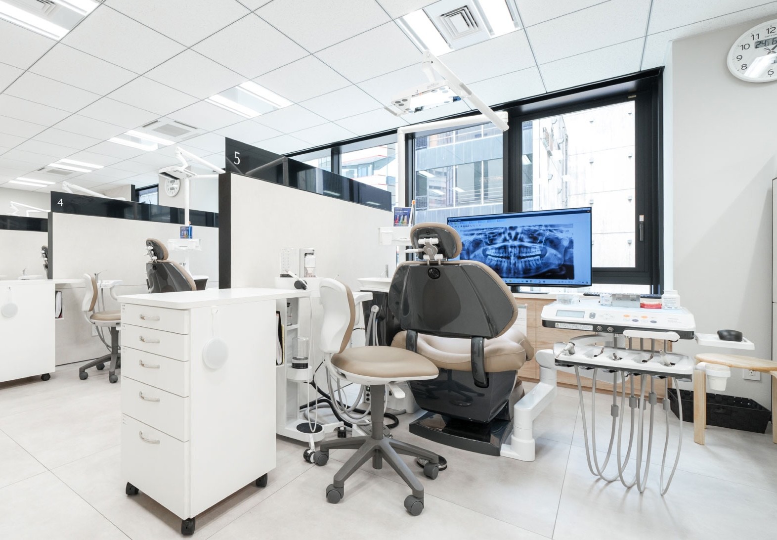 院内はプライバシー保護と飛沫感染予防のため、診療スペースがすべて完全個室です。正確な診断に欠かせない歯科用CTも完備しており、安全性の高い治療につなげています。初診には約60分、その後も一人ひとりに時間をかけて丁寧に診療を行う方針です。