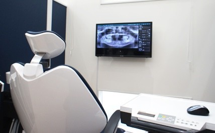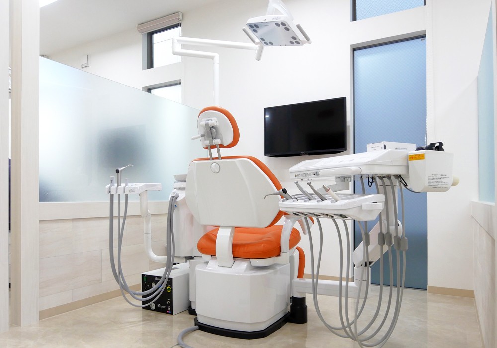 院内設備も充実しており、車いすやベビーカーのまま入室できるファミリールームを用意。小さなお子さまとご一緒に診療を受けられるほか、座った姿勢の角度のまま倒れる腰への負担が少ない診療台を導入しています。また、高精細な立体映像で診断を行う歯科用CTや、短時間で型取りができる口腔内スキャナーなど、精密かつ身体への負担に配慮した設備です。