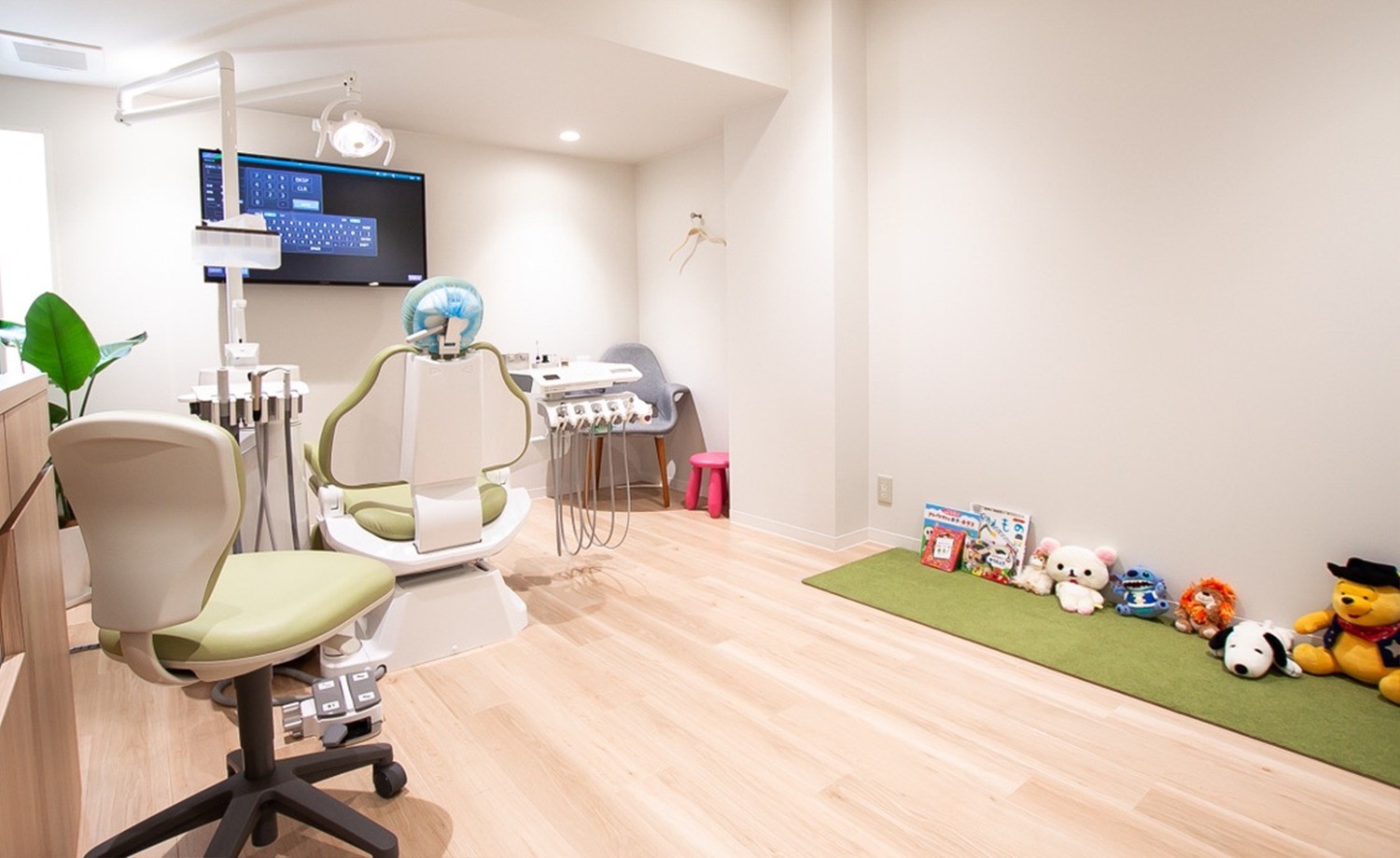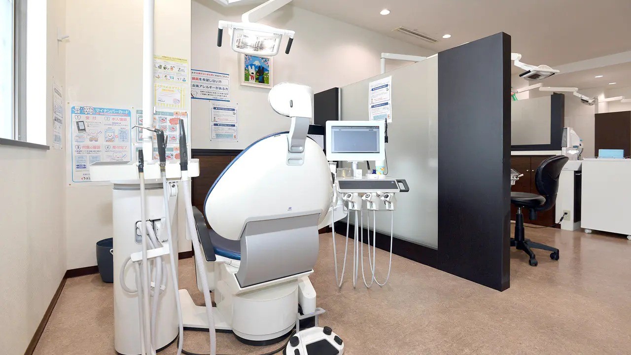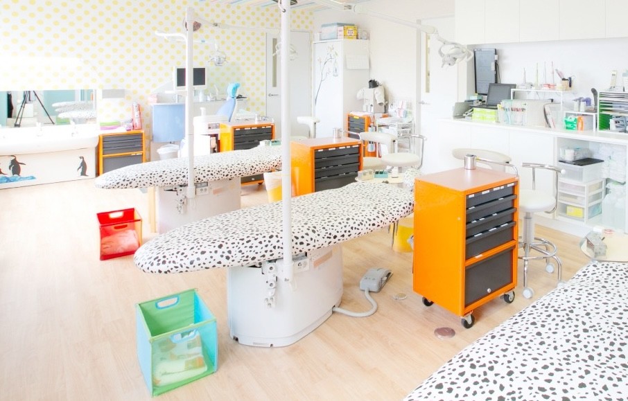 院内には、開放感のある広い待合室やパウダーコーナーが設置されています。キッズスペースやおむつ交換台が備わっているほか、ベビーカーのまま入れる広い診療室や、お子様と一緒に入れるキッズスペース付きの個室も用意されています。各診療台にはモニターが設置され、視覚的にわかりやすい説明を受けられるため、安心して治療を受けられるでしょう。