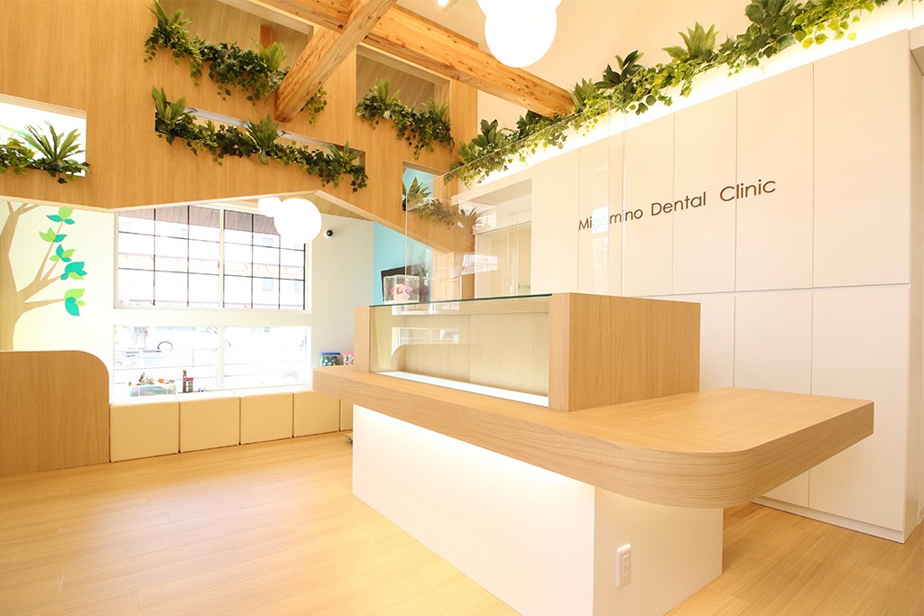 院内はファミリー診療室にキッズスペースを備え、お子様専用パウダールームやおむつ交換台も完備。院内はバリアフリーで移動しやすく、白の木材を基調とした空間です。精密な治療を支える歯科用CTやマイクロスコープも導入しており、親子でリラックスしながらも、制度の高い診療を受けられる環境が整っています。
