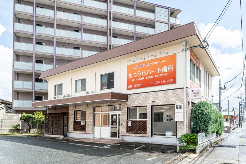 まつうらハート歯科は、JR箱崎駅 東口から北東へ徒歩11分の県道21号線沿いに位置しています。5台分の駐車場を完備しており、吉野家福岡原田店の向かい側という分かりやすい立地です。土日も診療を行っているため、平日忙しい患者様でも無理なく通院できる体制が整っています。