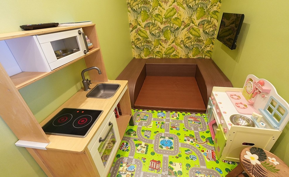 院内にはキッズスペースやおむつ交換台、ベビーチェアが完備されているほか、キッズスペースやベンチを併設した診療室も用意されています。お母様の治療中も目の届く範囲でお子様を遊ばせておけるため、安心して受診できる環境です。
