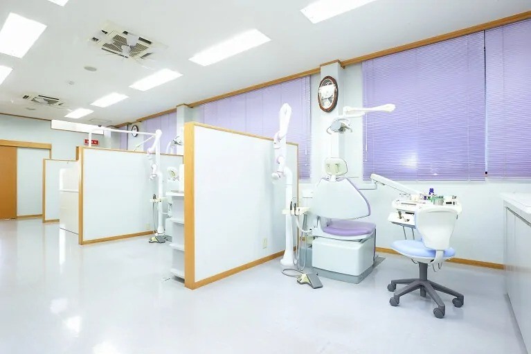 診療台は閉鎖感のない半個室タイプを採用し、隣の患者様から様子が見えないよう配慮されています。キッズスペースを備えているほか、給水管除菌装置「ポセイドン」の導入など、感染予防を徹底した清潔な環境です。