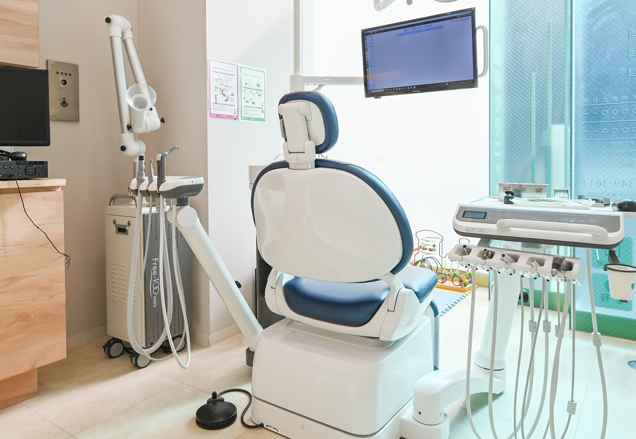 院内は段差のないバリアフリー設計で、車椅子やベビーカーの患者様もスムーズに移動が可能です。待合室や診療室には空気清浄機が設置され、清潔な空間が保たれています。診療室はパーティションで仕切られプライバシーを重視。各ユニットのモニターで画像を確認しながら、一つひとつ丁寧な説明を受けられる環境が整っています。