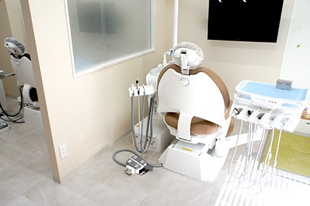 パーテーションで仕切られた診療室には、リラックスできる大きな背もたれのチェアーを導入しています。お子様連れの患者様のために、おもちゃで遊べる環境や予約制の託児にも対応しており、家族で安心して通える環境です。