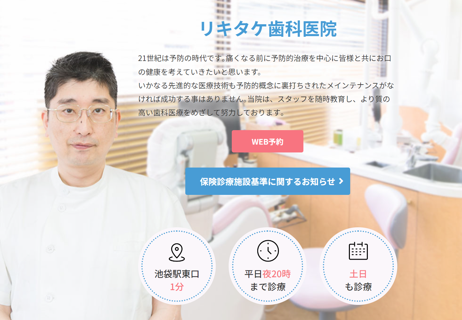 リキタケ歯科医院は池袋東口から徒歩1分、池袋西武百貨店の南隣に位置し、診療時間は月~金曜日が10時から20時まで、土・日曜日が10時から17時までです。