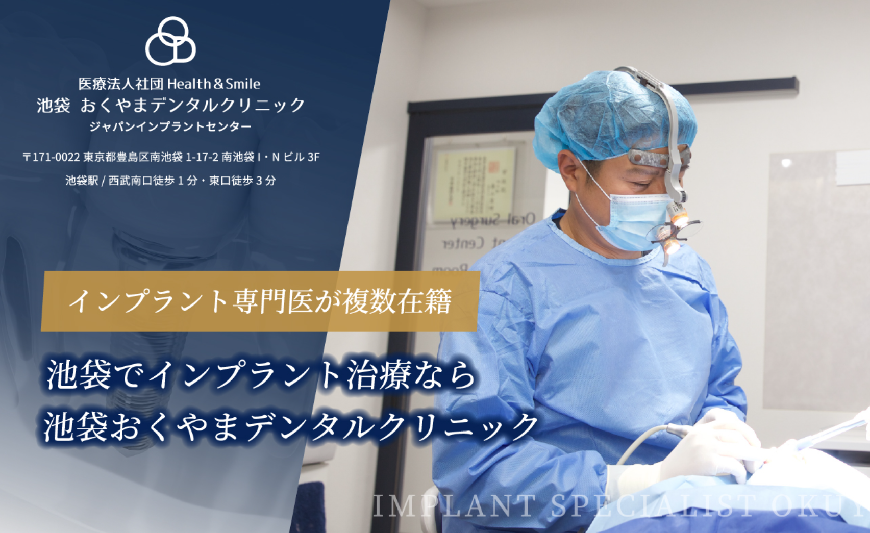 池袋おくやまデンタルクリニックは、池袋駅南口から徒歩1分の場所にあり、診療内容は虫歯やセラミック、矯正歯科、歯周病、口腔外科などがあります。 こちらのクリニックには、インプラント専門医が複数名在籍しており、専用の手術室を設置するなど、安全に治療を受けていただくことができる環境が整っております。さらに、インプラントガイドシステムを導入しており、精密なシミュレーションを行うことが可能です。