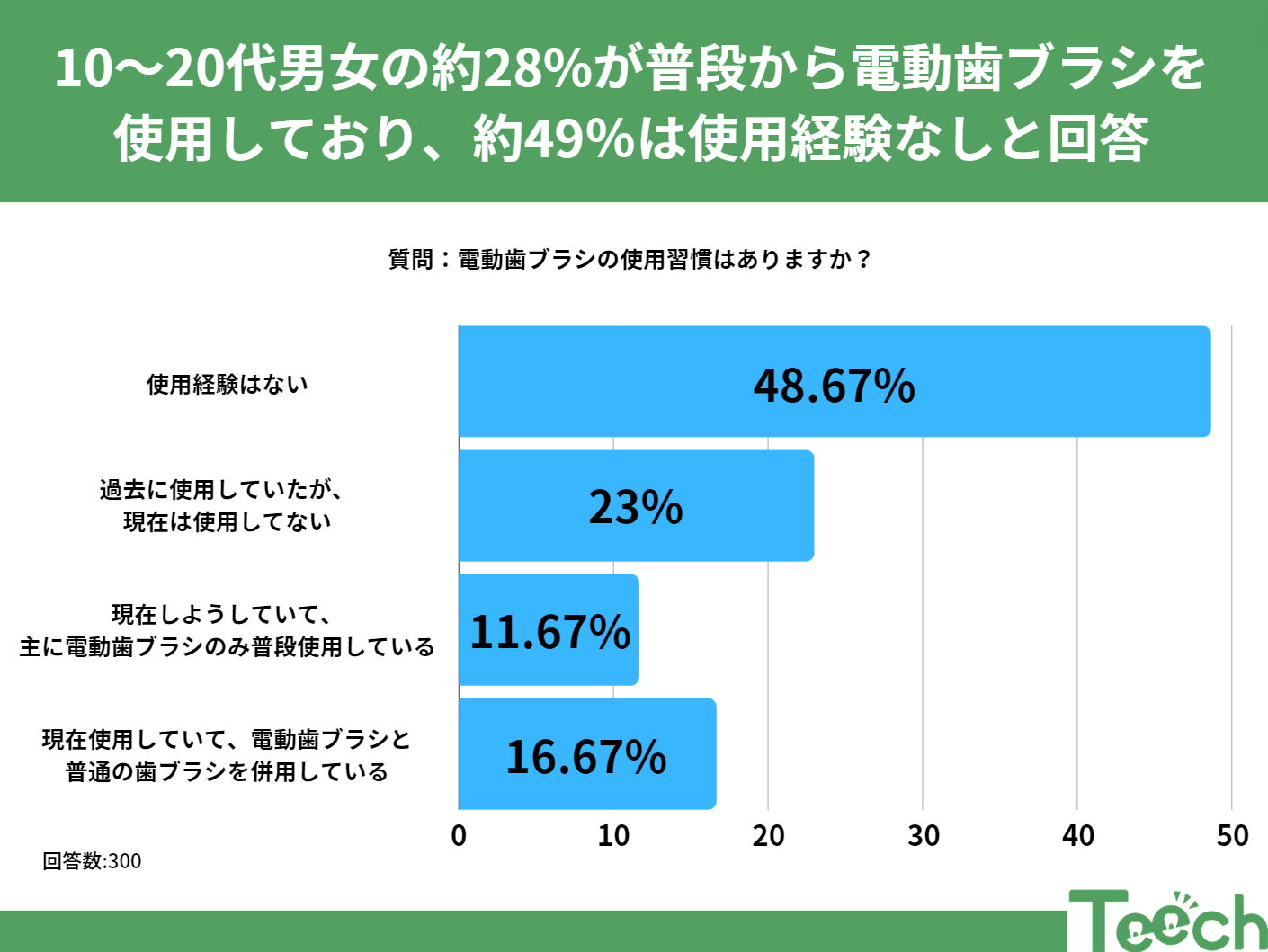 最新のアンケート結果によれば、10代〜20代の男女のうち、28%が普段から電動歯ブラシを使用していることが判明しました。しかし、驚くべきことに、48.67%が電動歯ブラシを使ったことがないと回答しており、この数字は電動歯ブラシの普及にまだ大きな余地があることを示しています。