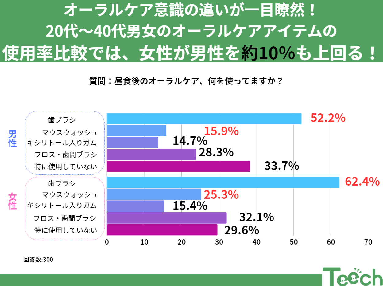 さらに、特定のオーラルケア製品に目を向けてみると、歯ブラシ使用では女性が62.4%と男性の52.2%を上回ります。また、マウスウォッシュでは女性が25.3%、男性が15.9%と、特にこの製品においては女性の方がずっと積極的です。これらの数字から、健康で清潔な口内環境を保つことへの女性の強い関心が読み取れます。