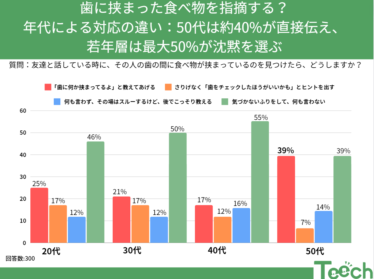 特に注目されるのは、50代が他の年代と比べて約40%の人々が友人に直接「歯に何か挟まっているよ」と伝える傾向にある点です。一方で、若年層は気づかないふりをすることを選択することが多いという結果が出ました。20代では約46%、30代では約50%がこの選択をします。
