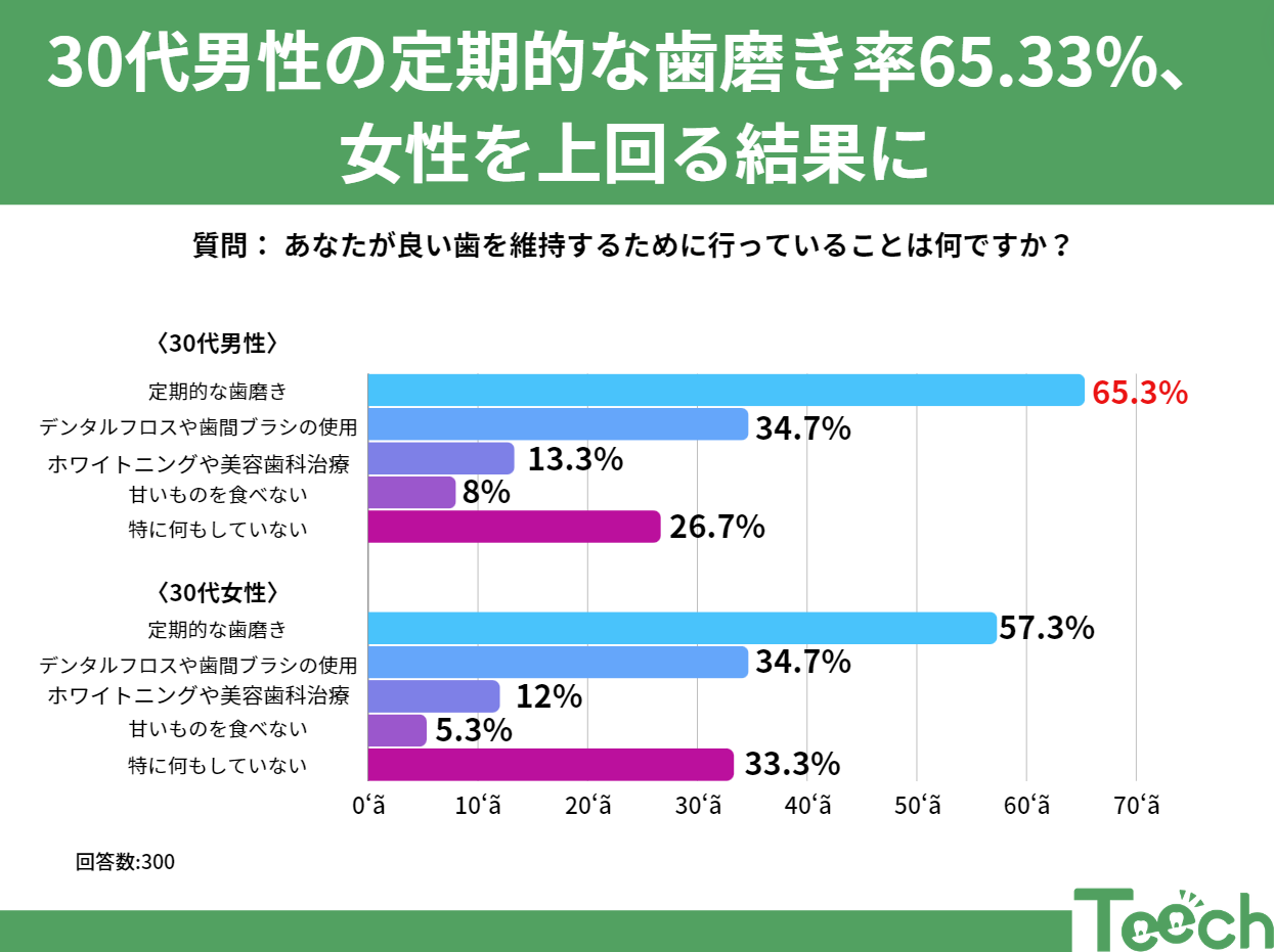 また、30代になると、特に男性のデータに興味深い変化が見られます。30代男性は、定期的な歯磨きにおいて65.33%という高い割合を示し、これは女性の57.33%を上回っています。これは、30代というキャリア形成期に入ると男性も外見や健康に対する意識が高まることを示しているのかもしれません。さらに、30代男性のデンタルフロスや歯間ブラシの使用率も34.67%と上昇し、性別間のギャップが縮小していることが観察できます。
