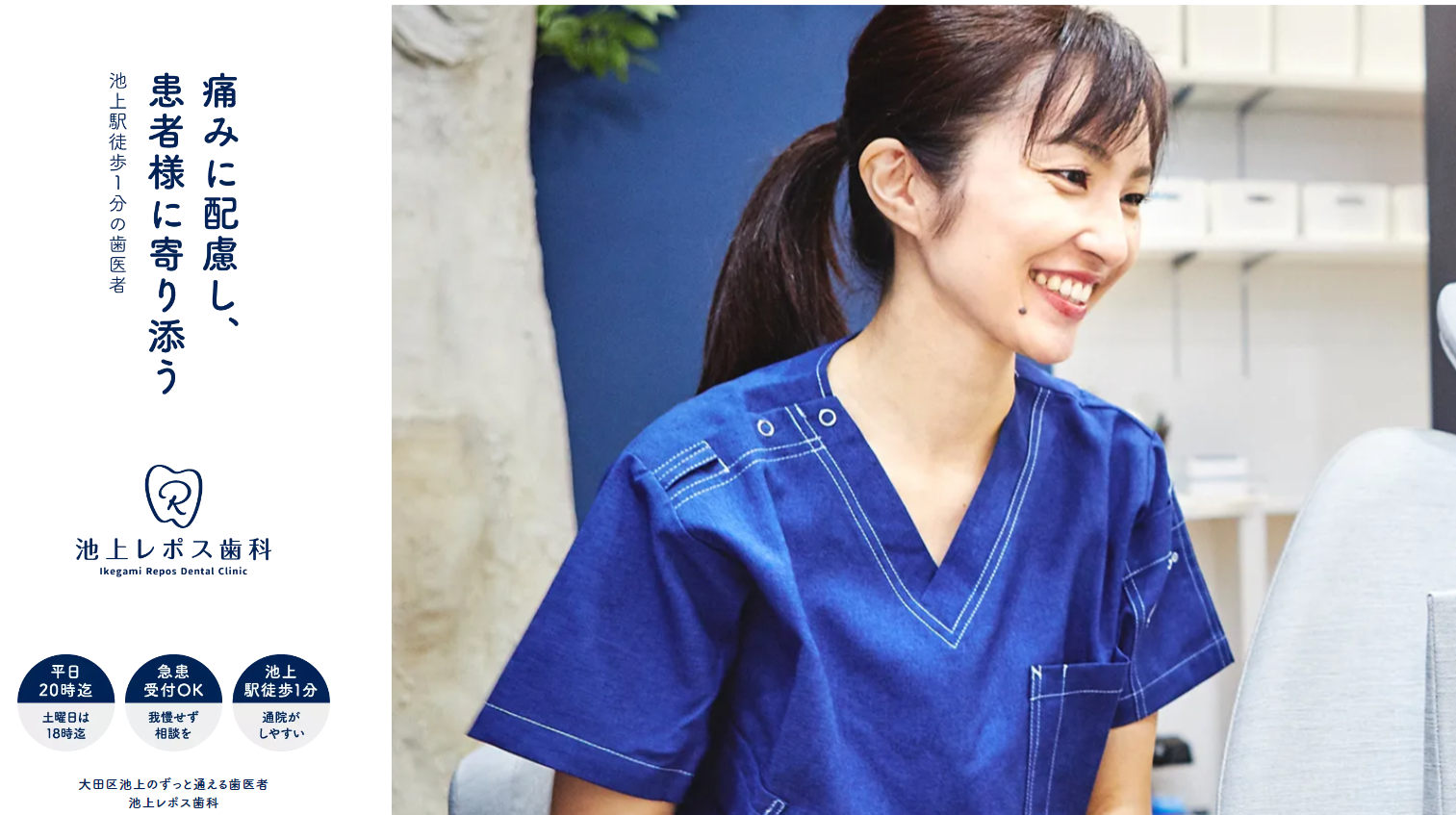 池上レポス歯科は、池上駅南口からわずか徒歩1分の位置にあり、平日は20時まで診療しておりますので、お忙しくてなかなか歯医者に行けないという方にもおすすめです。診療内容は、一般歯科からインプラント、矯正歯科、審美歯科など多岐にわたります。