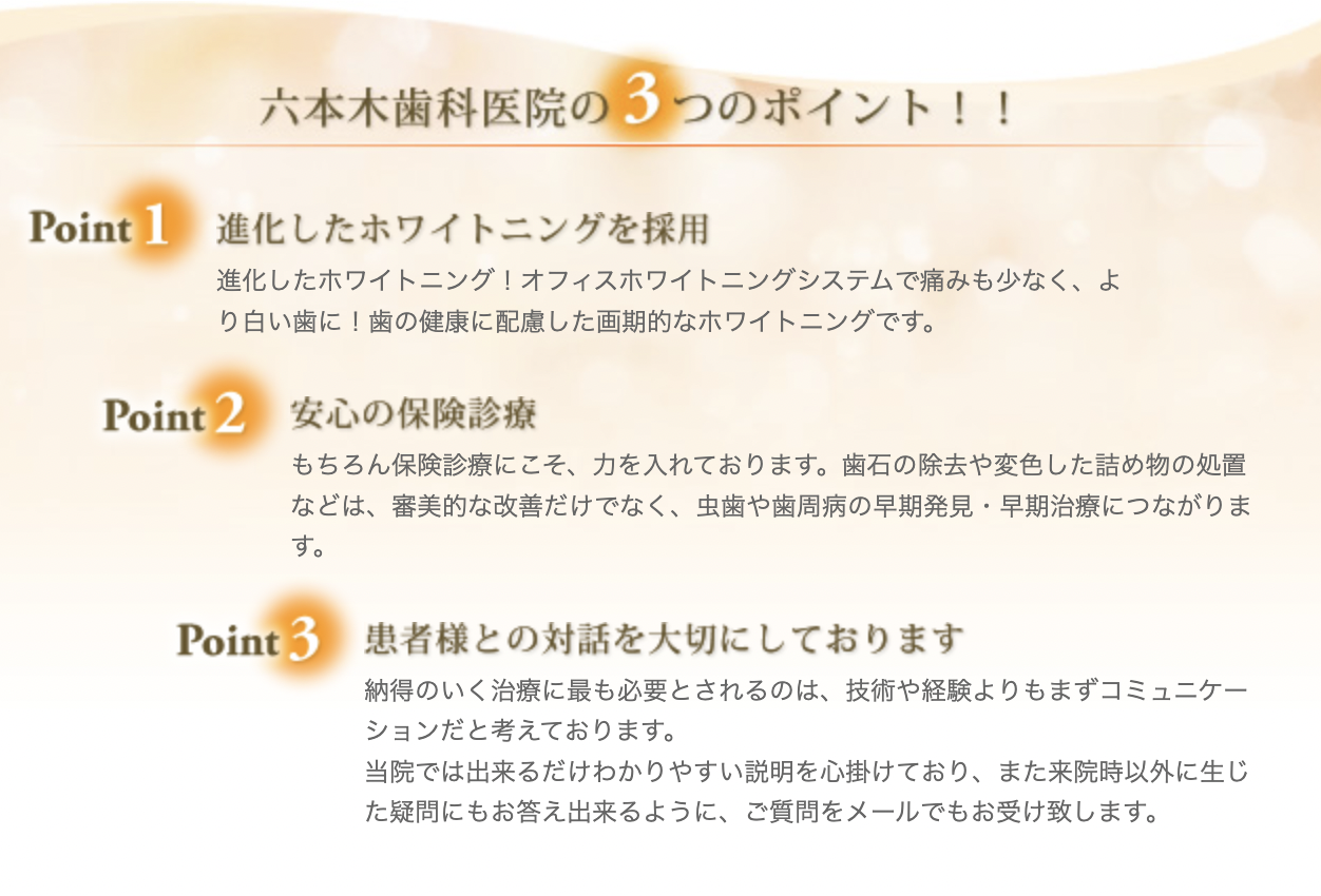 さらに、六本木歯科医院では技術や経験以上に患者様とのコミュニケーションを大切にしています。患者様の悩みや希望に対して分かりやすく親切丁寧なカウンセリングが好評です。 六本木駅周辺で、来院時以外に疑問がでたときでもメールで丁寧にサポートしてくれる歯科クリニックをお探しの方は、是非一度六本木歯科医院に相談してみてください。