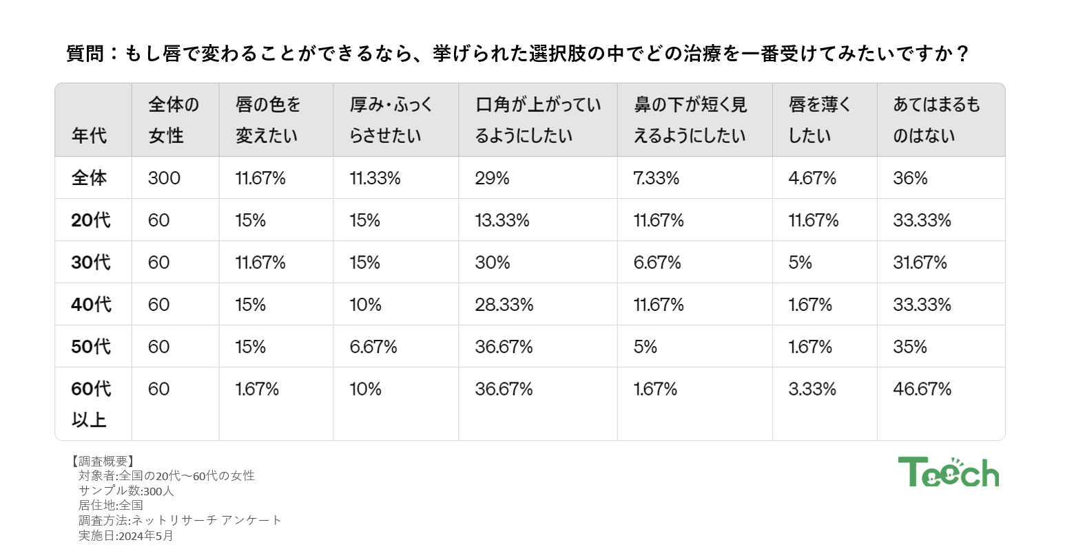 「もし唇で変わることができるなら、どの治療を受けたいですか?」この質問に対して、20代から60代の女性300人が彼女たちの唇の美容に対する願望を明かしました。