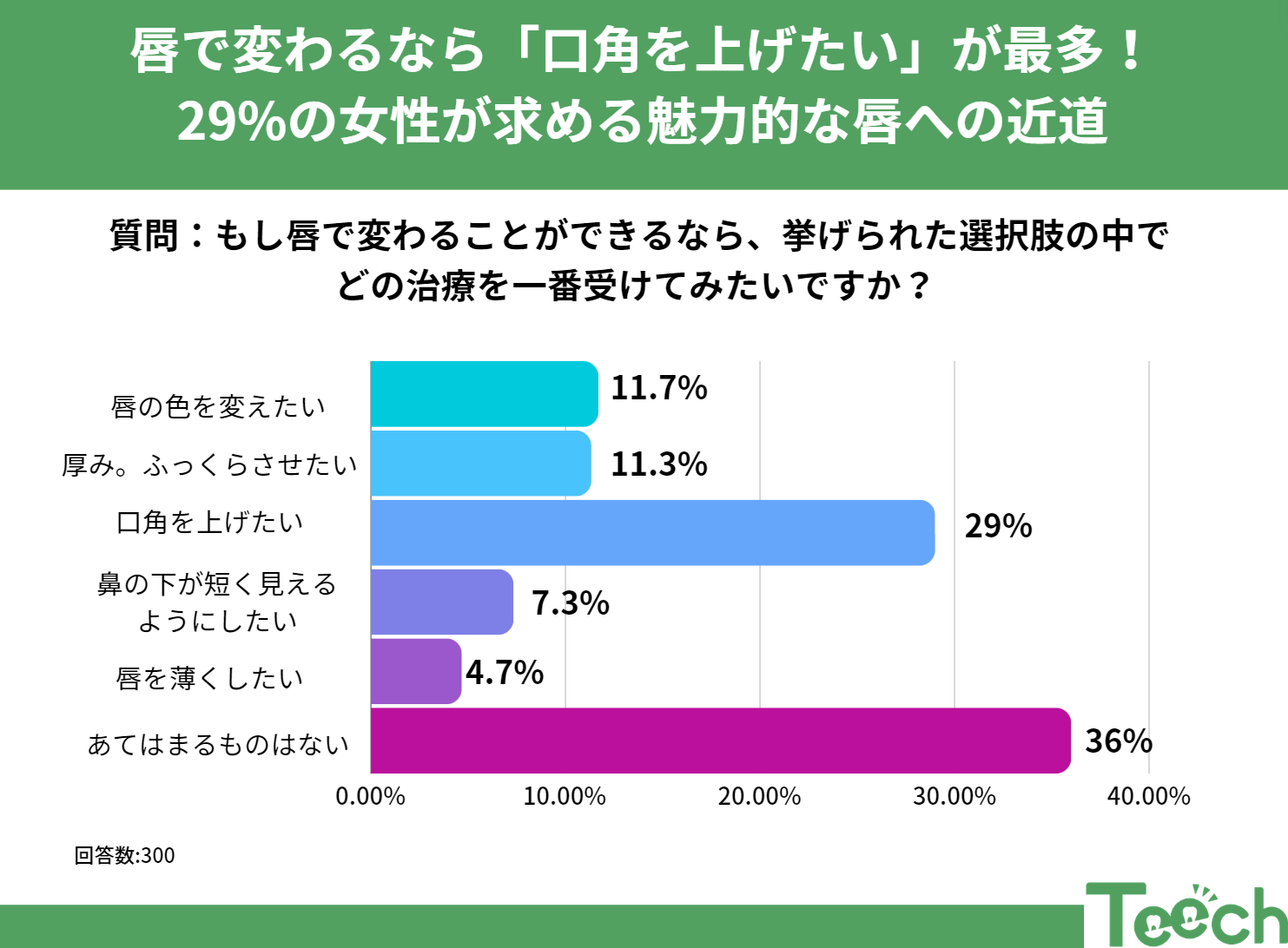 アンケート結果によると、特に口角を上げる治療への関心が高く、全体の29%がこの選択肢を選びました。これは、より明るく、若々しい印象を求める現代の美容ニーズを反映しています。口角を上げる治療は、表情をポジティブに見せ、その人の全体的な印象をかわいらしく、若返らせる効果があるため、多くの女性が関心を持っています。