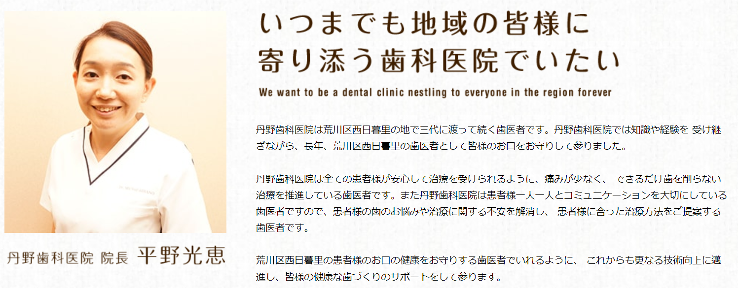 JR山手線 西日暮里駅より道灌山通りを進み徒歩3分にある丹野歯科医院は、60年以上にわたり西日暮里の患者様のお口の健康に携わってきた地域に根ざした医院です。