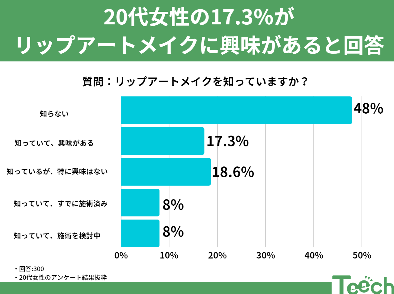 全体の12%がリップアートメイクに興味があり、特に若い世代ではその割合が高い結果となっています。興味はあるけれどもまだ試していない人々が多いのも事実。この新しいビューティートレンドがもっと知られるようになれば、より多くの人がこの美容法を試してみたくなるでしょう。