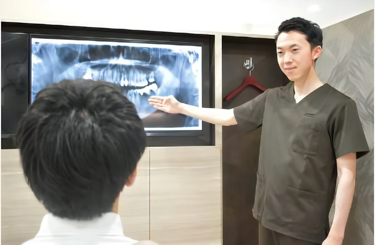 初診の患者様については、問診や口腔内の診察、レントゲン撮影などを行います。その後、診断結果に基づき院長自らカウンセリングを行い、治療プランを提案します。各治療法について説明し、患者様の疑問や不明点を解消するように心掛けています。