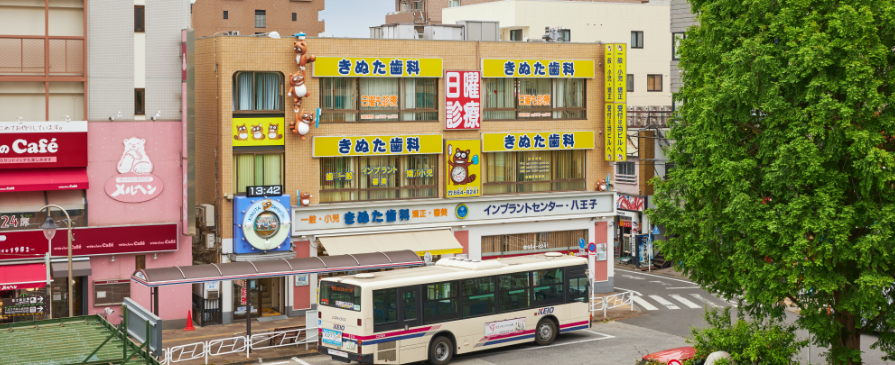 きぬた歯科は、西八王子駅 南口すぐのロータリー内にあり、駐車場完備の歯科医院です。日曜診療を行っており、平日はお仕事で通院が難しい方におすすめです。