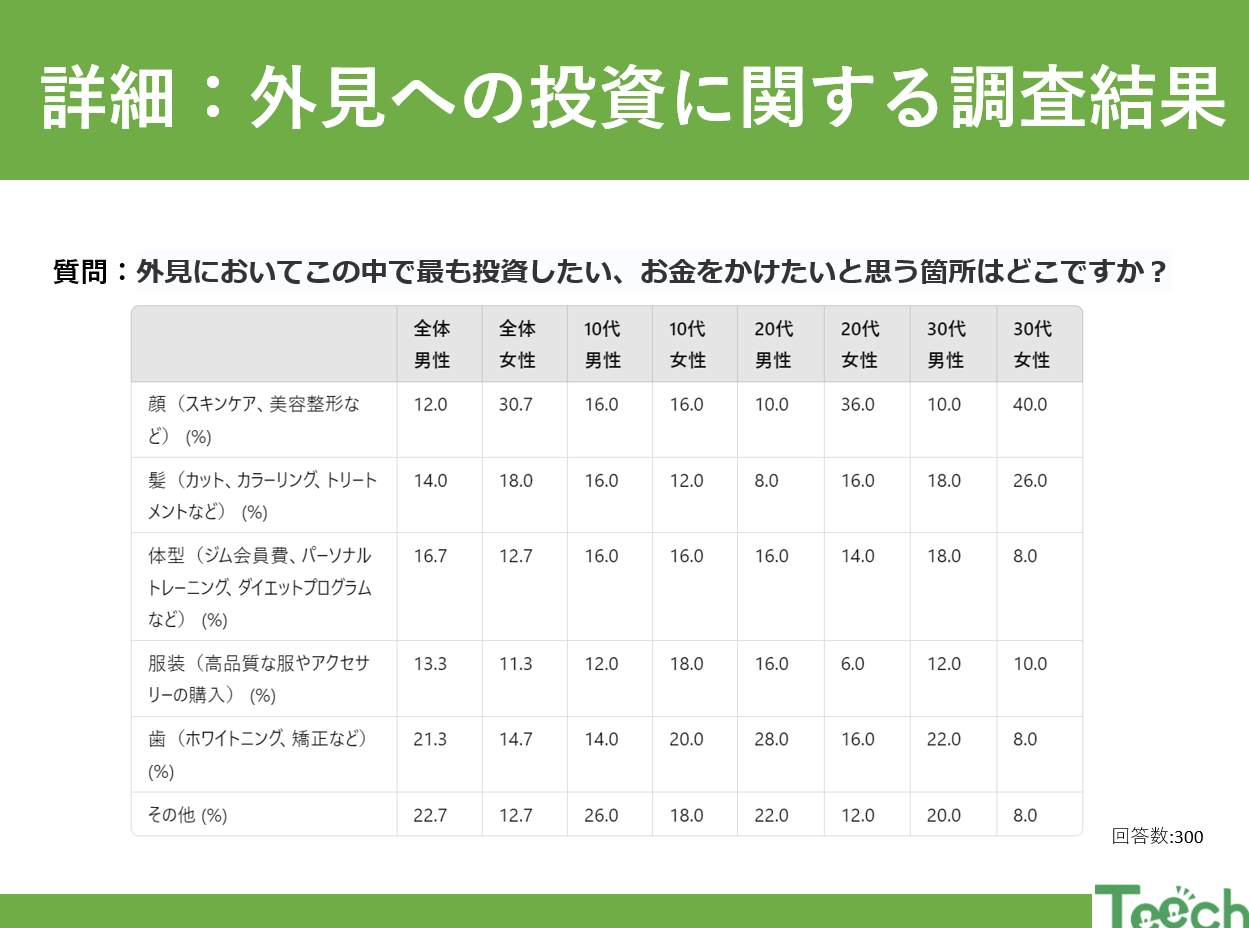 今回は「外見において最も投資したい、お金をかけたいと思う箇所」について、性別および年代別にアンケートを実施しました。アンケート内容は、外見においてこの中で最も投資したい、お金をかけたいと思う箇所はどこですか?というもので、10代から30代の男女を対象に調査しました。