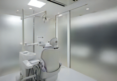 アイズデンタルオフィスの特徴の一つに、水平診療があります。人が最もリラックスできるのは寝ている体勢であり、多くの面で身体を支え、束縛しない状態が最もリラックスできます。院内の診療ユニットは、水平診療専用に開発されたチェアを採用しており、治療時にはほぼ水平の体勢が保たれ、血圧も一定に保つことができ、リラックスして治療を受けられます。
