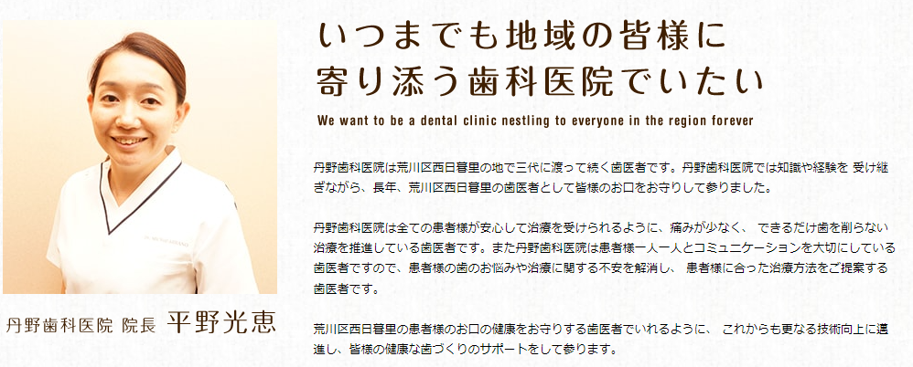 西日暮里駅から歩いて3分、千駄木駅から歩いて10分で行くことができる丹野歯科医院は、60年以上にわたって地域住民の歯の健康を守り続けてきたクリニックです。
