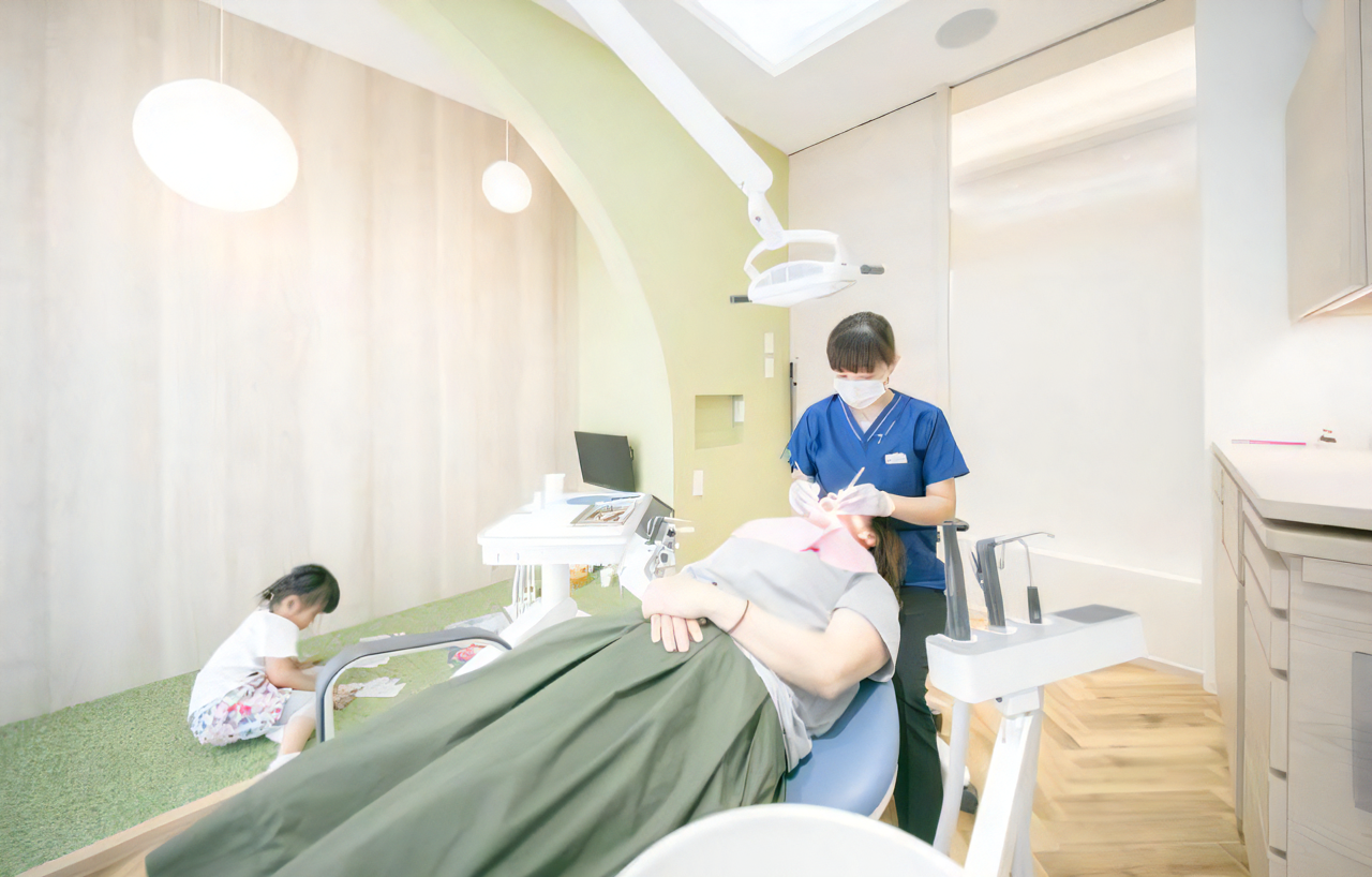 家族全員で楽しく通えるクリニックを目指しており、ベビーカーでも院内にスムーズに入れるのが特徴です。キッズスペースやおむつ替えシートも完備されており、キッズスペースにはお子様が喜ぶおもちゃや絵本が揃っています。また、保護者が治療を受ける際には、個室診療室にお子様と一緒に入ることができ、安心して治療を受けられる環境が整っています。