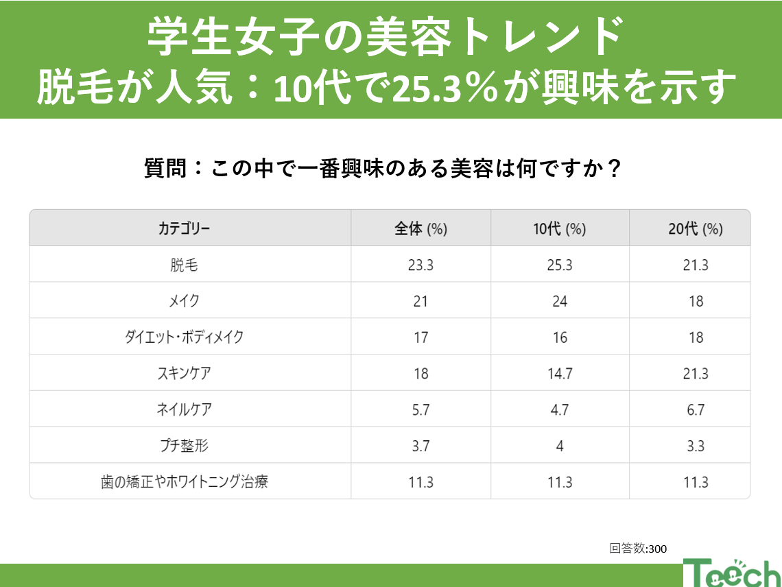 10代〜20代の学生はどんな美容に興味があるのでしょうか?現代の若者たちは、美容に対する意識が非常に高く、日々の生活の中でさまざまな美容ケアを取り入れています。特に、学生の間では、どのような美容法が人気を集めているのか興味深いテーマです。そこで、美容に関するアンケートを10代から20代の学生女子300名を対象に行い、その結果を分析しました。その結果、最も関心を持っている美容ケアは「脱毛」であることが明らかになりました。