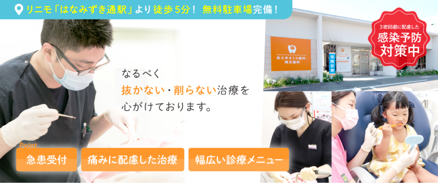長久手さくら歯科・矯正歯科は、はなみずき通駅1番出口から徒歩5分の位置にあり、祝日も診療しています。