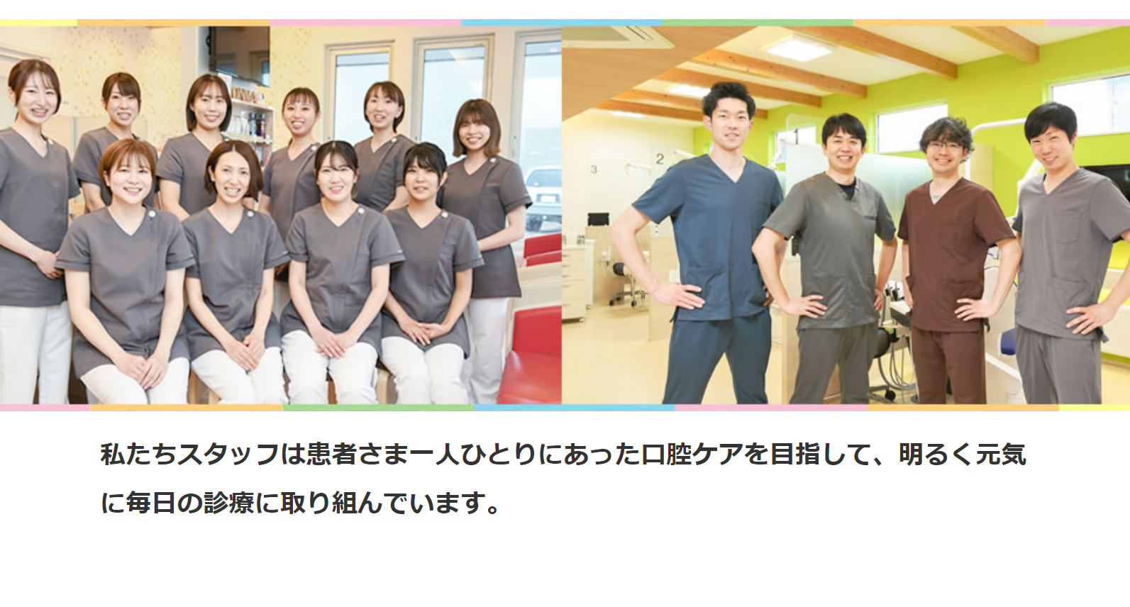 どなたでも通いやすい「優しく・明るく・痛くない」をモットーにした、医院作りを行っています。ひとつの治療法の専門家ではなく、どんな治療・症例にも対応できるプロフェッショナルな頼れる町医者として、患者様へ質の高い治療を提供できるよう努めています。 安心安全な治療ができるよう、充実した設備を整備するだけでなく、ドクターとスタッフで日々知識と技術のアップデートに取り組んでいます。患者様としっかりと向き合って話し合い、お口の中を正確に把握してご希望に沿った治療を提供します。