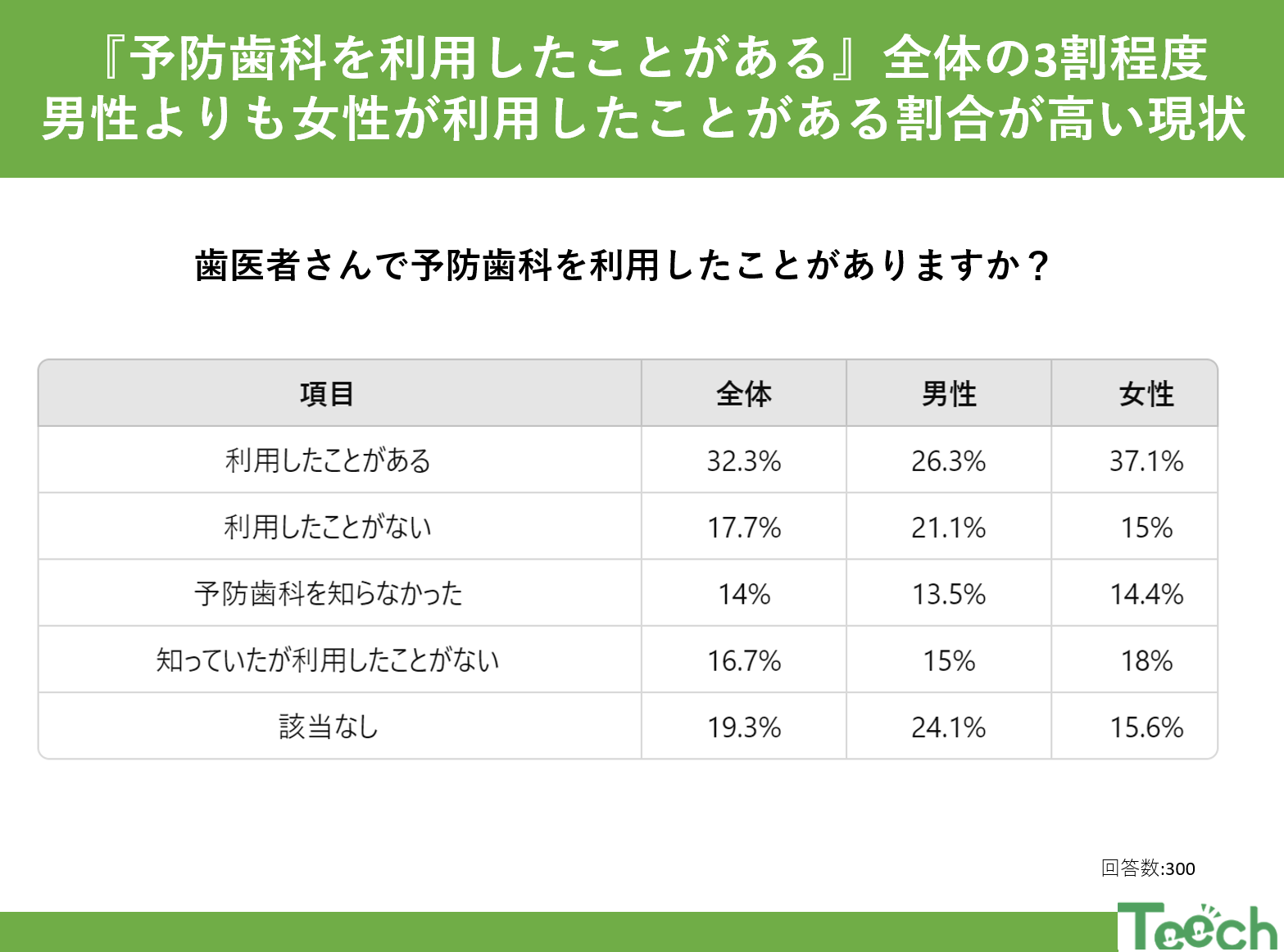 そこで今回は、予防歯科についての認知度を把握するために10代から40代の男女300名に「歯医者さんで予防歯科を利用したことがありますか?」という アンケートを実施しました。