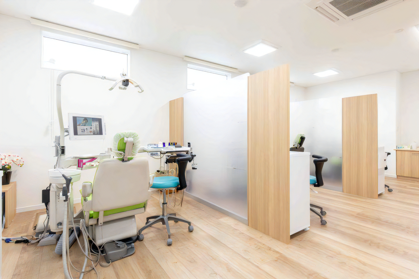 診療台の配置にも工夫がなされており、他の患者様の視線が気にならないよう十分なスペースが確保されています。チェアーサイドのモニターでは、レントゲン画像の確認やDVDの鑑賞が可能です。